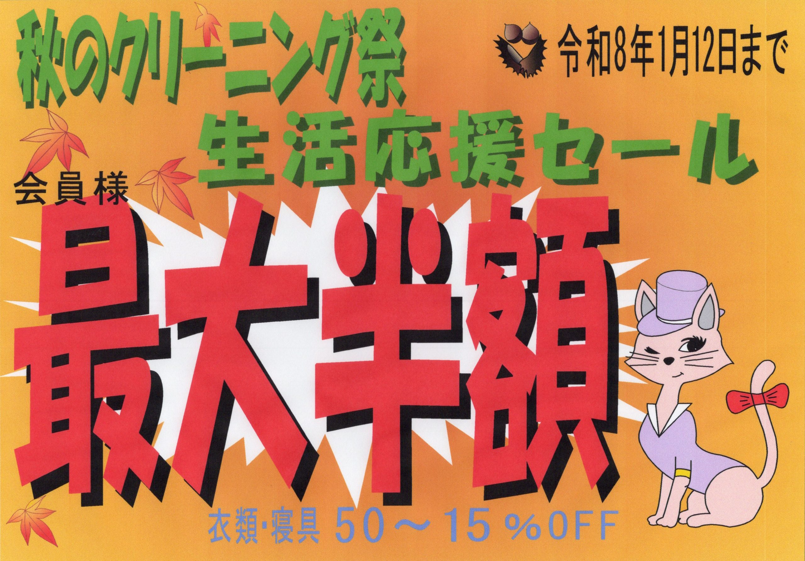 秋のクリーニング祭生活応援セール Posted 2025年10月1日 by mo000505 Tweet いつも末広ドライをご利用いただきありがとうございます。 令和8年1月12日(月)まで、秋のクリーニング祭生活応援セールを実施いたします。 ご来店お待ちしております。